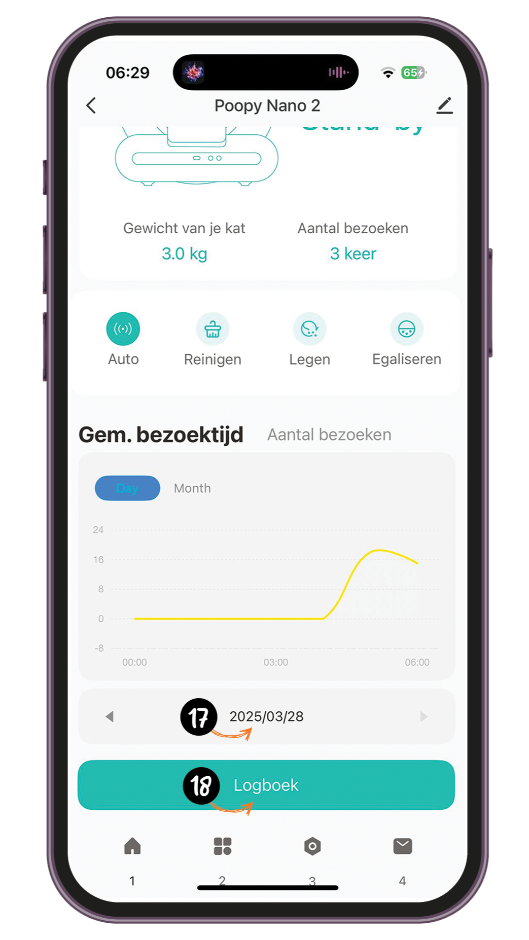 The log keeps track of all activities of the Poopy Nano 2, such as cleaning cycles, visits from your cat and any notifications or alerts. This gives you an overview of the litter box's use and performance over time.