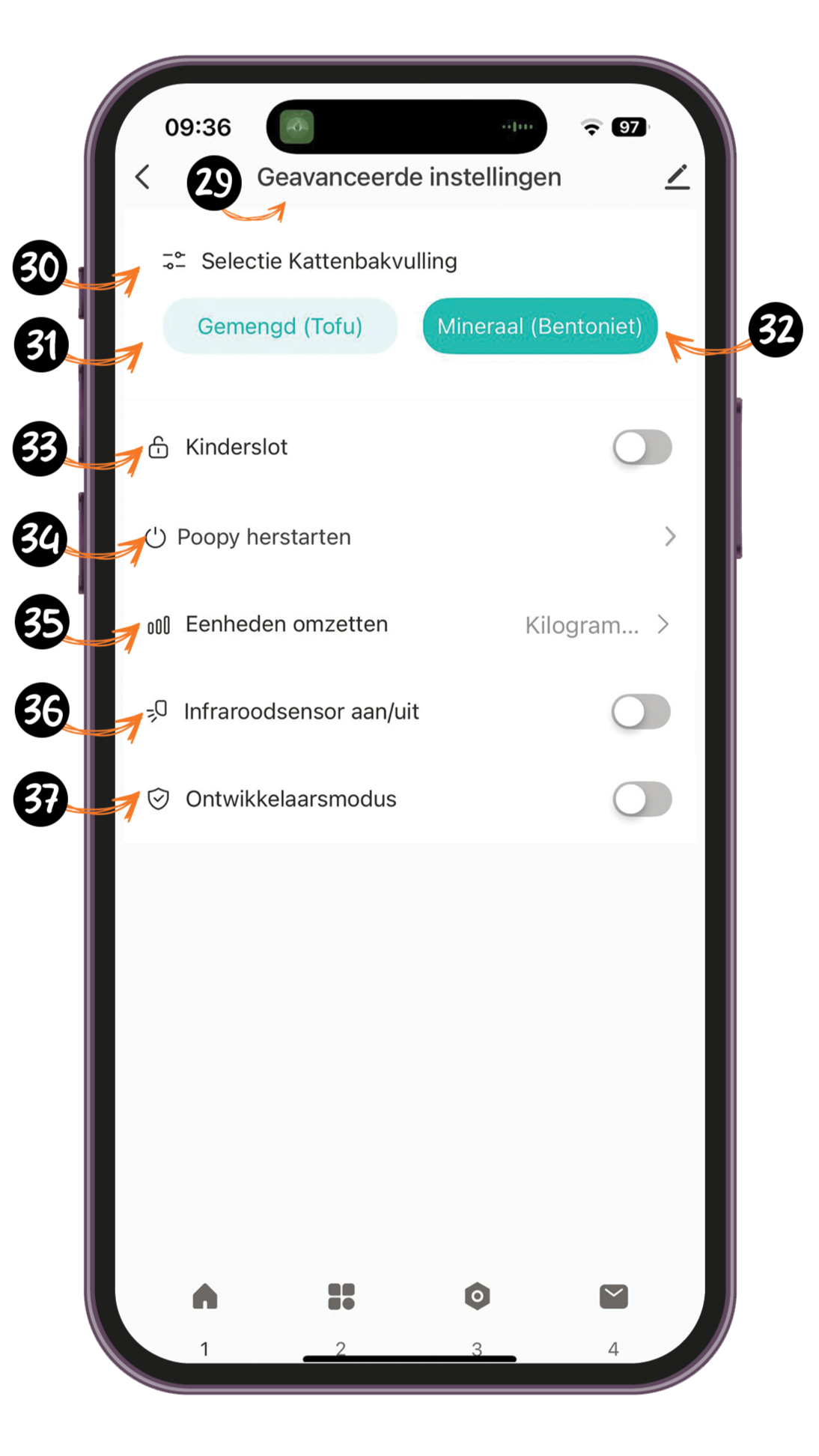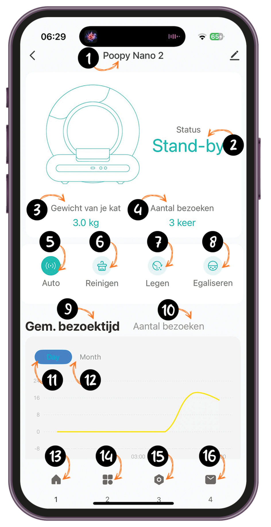 This is the name of the device you are controlling through the app. Here you see the model of the Poopy that is connected. You can determine the name yourself by clicking edit. Suppose you have two Poopy's, it is convenient to choose your own name, for example, "Poopy Nano 2 - Living Room" or "Poopy Nano 2 - Bedroom."