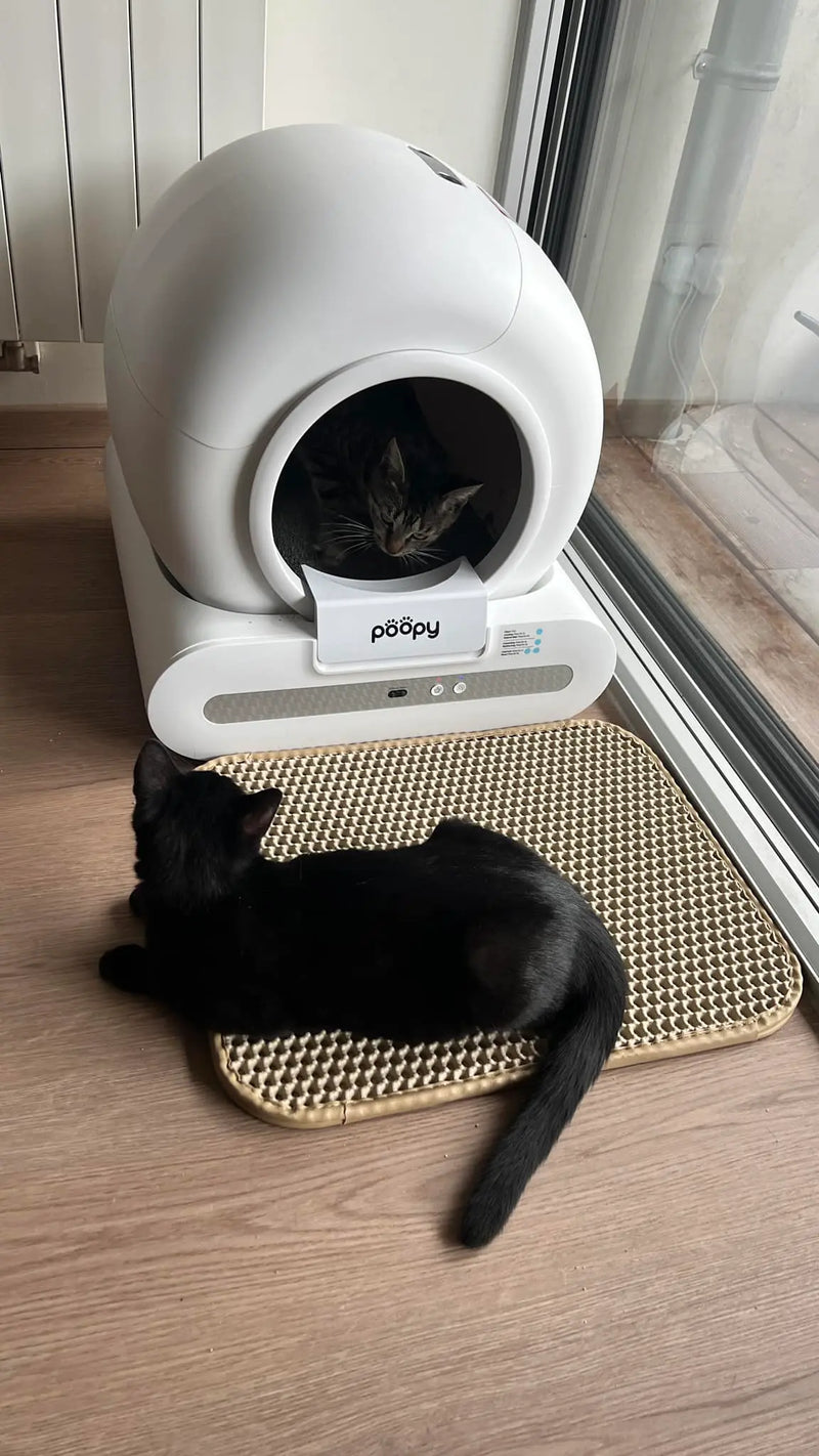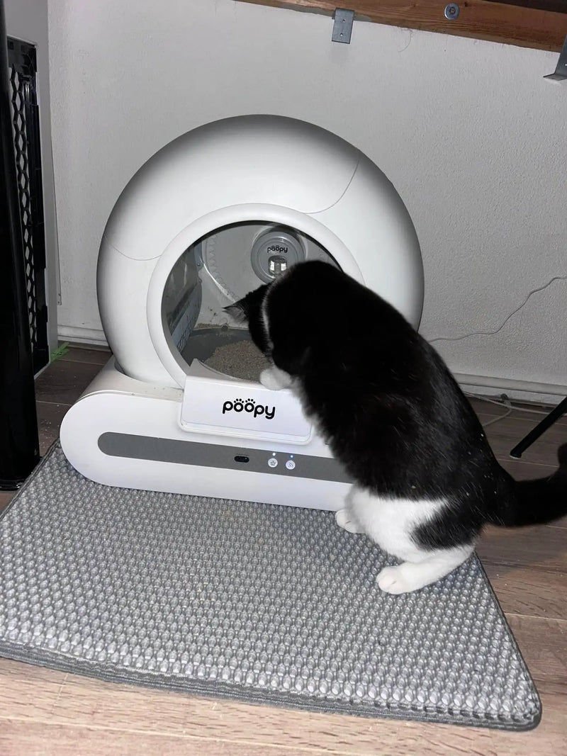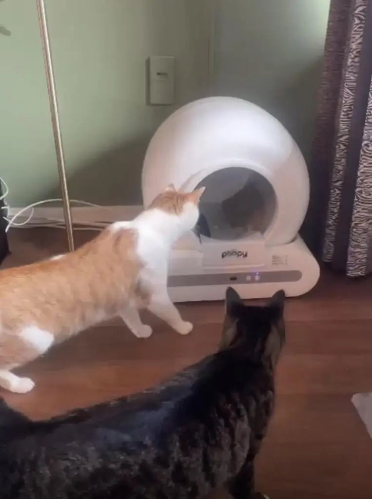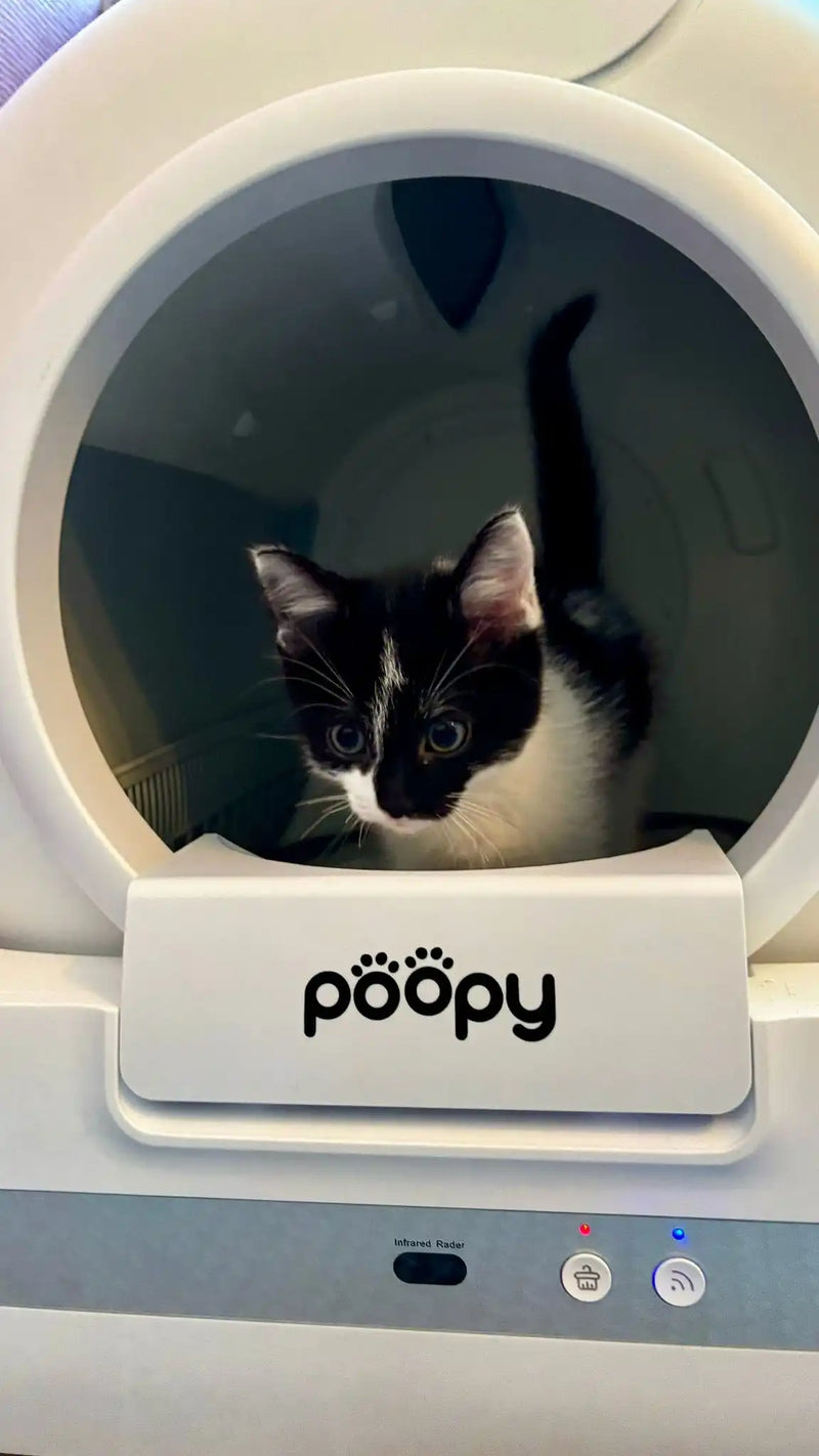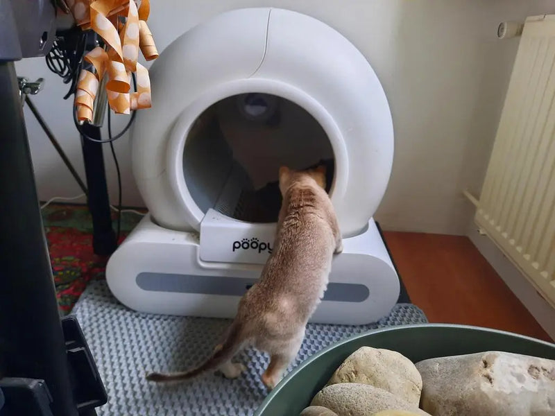 Every cat is different. Most cats accept the Poopy quickly, but some need some time to get used to the automatic cleaning mechanism. Therefore, introduce the Poopy gently and gradually.
