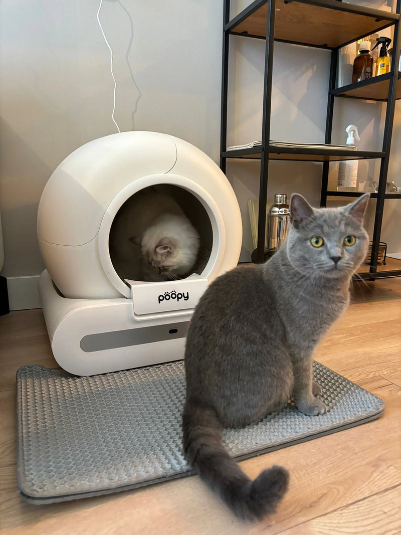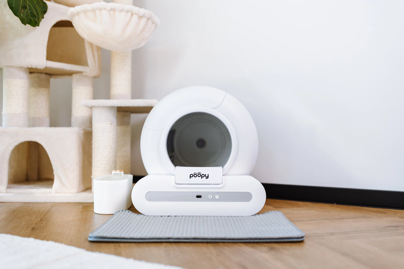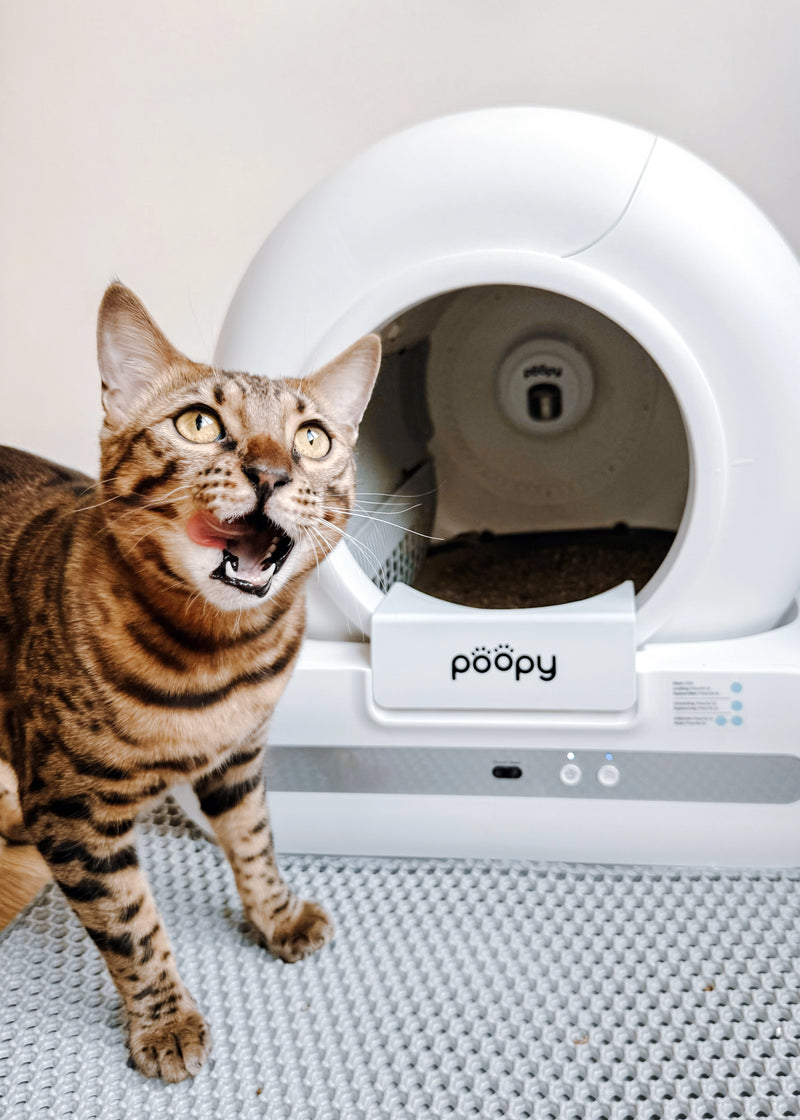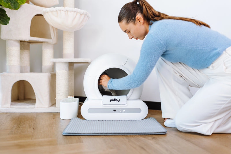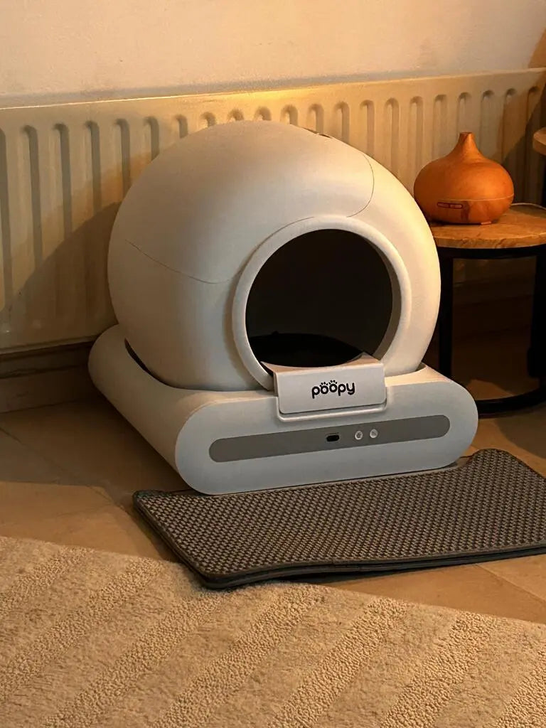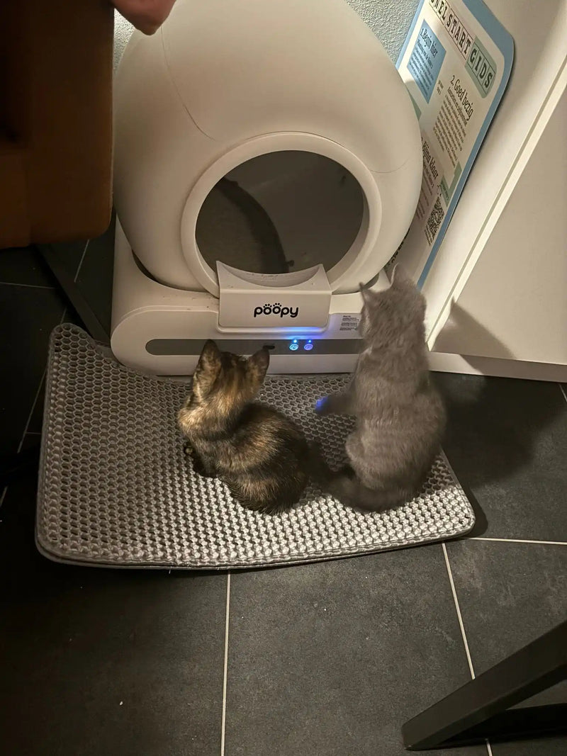 Every cat is different. Most cats accept the Poopy quickly, but some need some time to get used to the automatic cleaning mechanism. Therefore, introduce the Poopy gently and gradually.