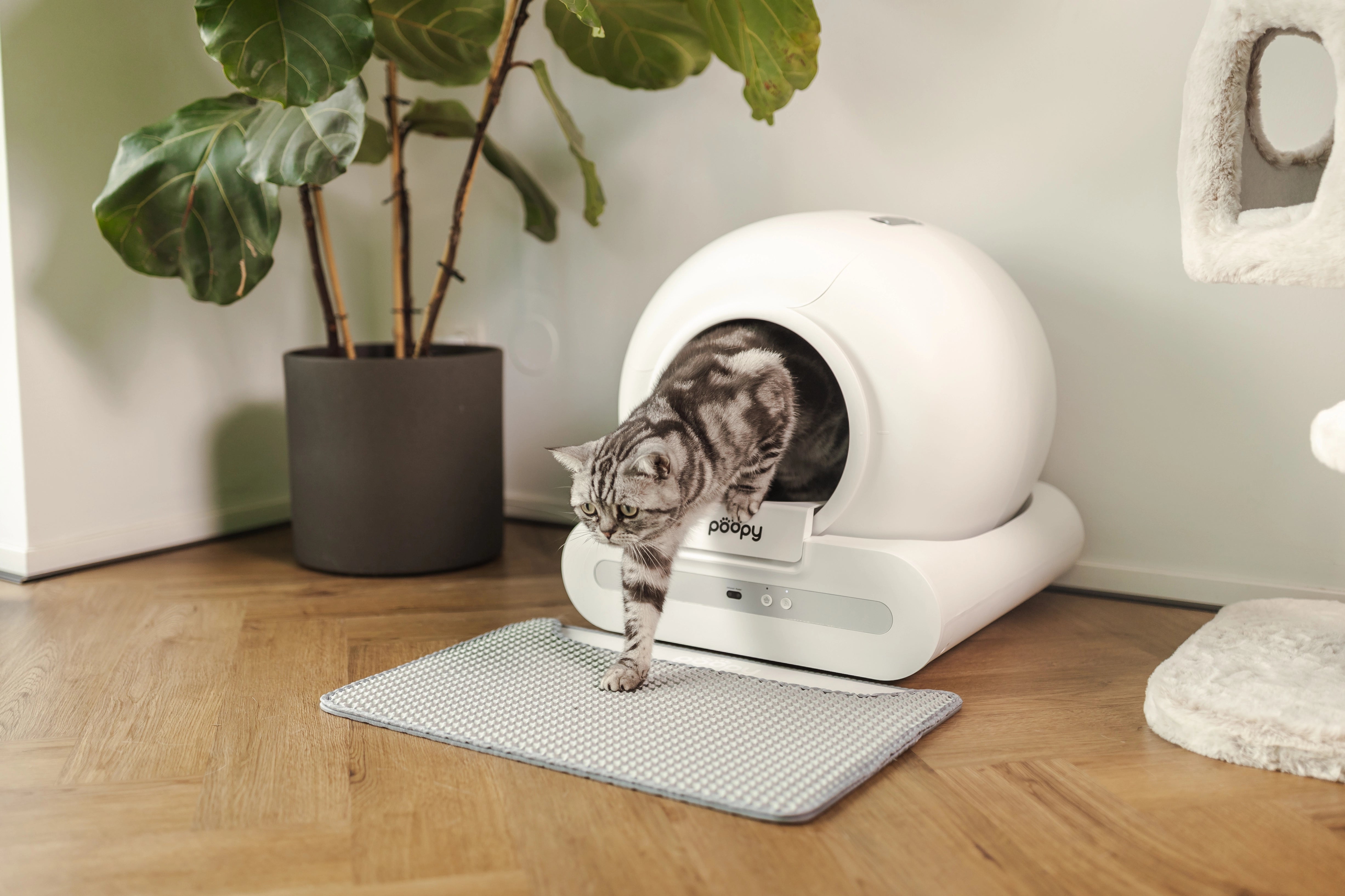 Poopy notices as soon as your cat goes in or out. You set after how many minutes cleaning starts. Safety sensors stop immediately if your cat comes back in.