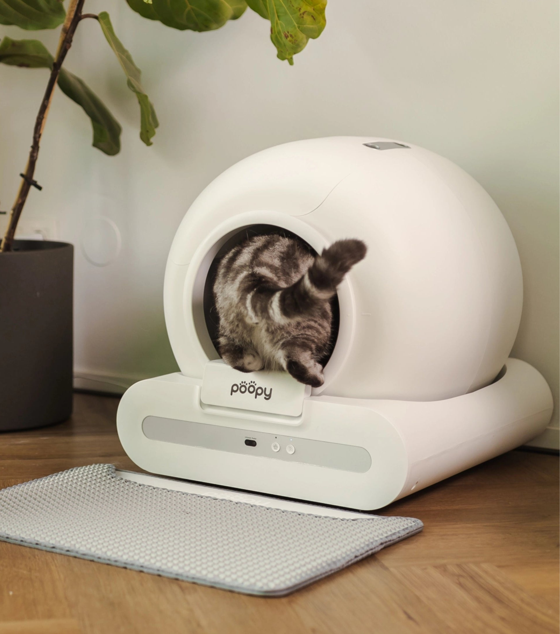 Poopy notices as soon as your cat goes in or out. You set after how many minutes cleaning starts. Safety sensors stop immediately if your cat comes back in.